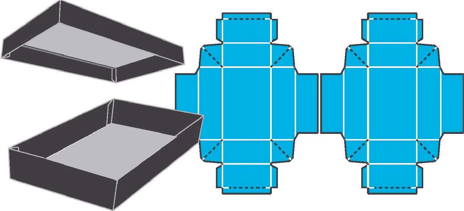 This tray is glued and the easiest of all the trays for the user to assemble. The tray may be used as a two-piece carton, or as a tray with an attached lid that can be folded into a display. This style is used mostly in the bakery and garment industries. Another version is a Six Corner Beers.